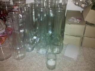 tons of vases for the reception tables. gonna fill them with red flowers. and then 150 votive candle holders and tea lights.